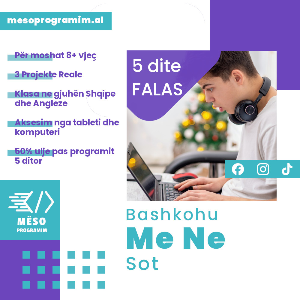 Fëmija juaj mund të fillojë të mësojë programim që nga mosha 9-vjeçare. Në këtë moshë, ata janë të aftë të kuptojnë konceptet bazë përmes lojërave edukative dhe projekteve argëtuese që i bëjnë mësimet interesante dhe të kuptueshme. Kurset tona janë të përshtatura posaçërisht për këtë grupmoshë.